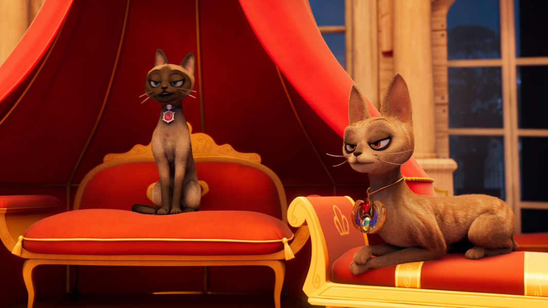 Az éjszaka közepén egy rejtélyes, hosszú karmú, pöttyös bundájú, faragott maszkot viselő macska tör be a királynő hálószobájába. Elrabolják a királynőt! Segítség!