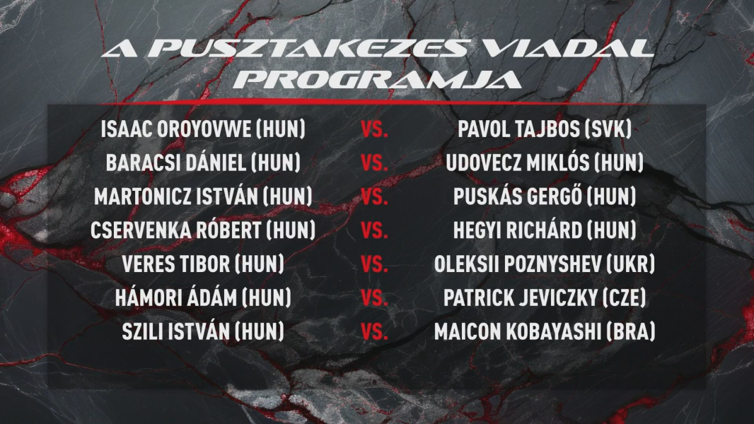 A három fő meccsen pedig olyan neves magyar versenyzők lépnek szorítóba, mint Veres Tibor, Hámori Ádám és a küzdősportok rajongói körében leginkább ismert Szili István, akik mind külföldi ellenfelekkel néznek szembe.