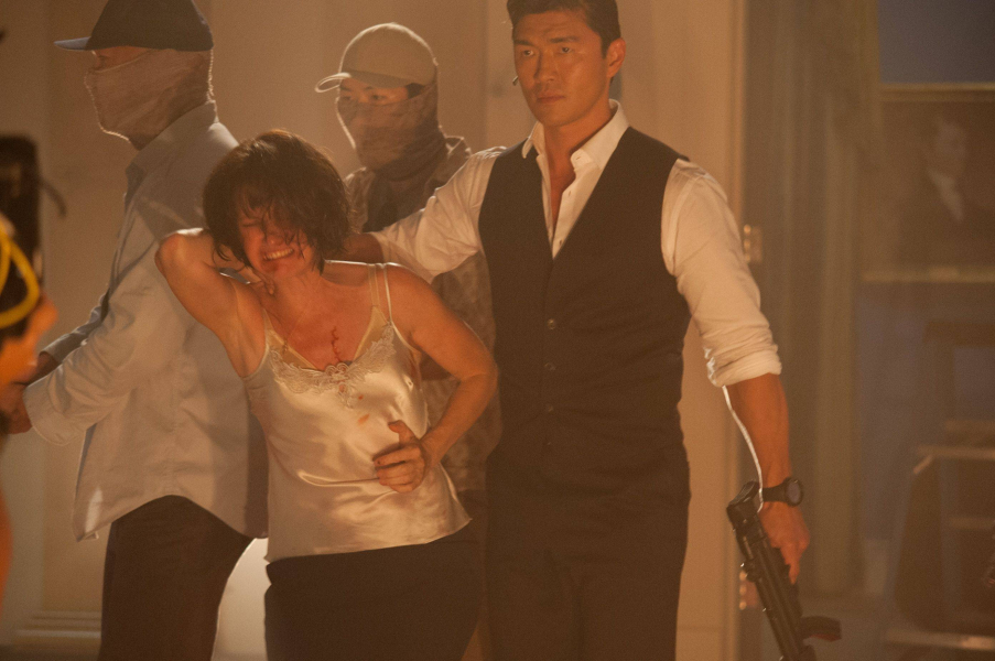 (akció film, 2013.) Asher elnök (Aaron Eckhart) válság megoldó találkozóra készül a dél-koreai miniszterrel.