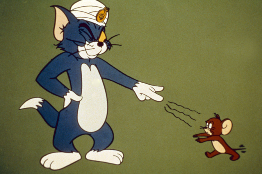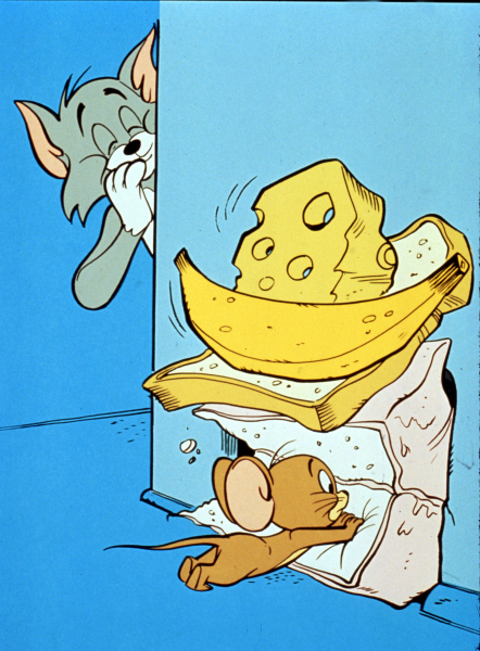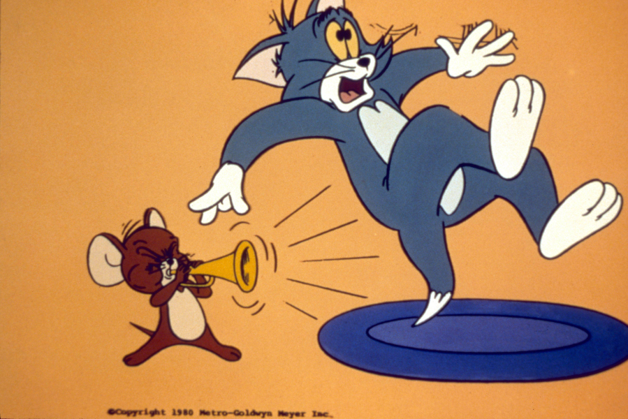 (Viszlát, egérke/Droopy álmatlan éjszakái/Új egér a házban - animációs sorozat, 1980.) Tom általában sikertelenül próbálja elfogni Jerry-t, hatalmas esések, balesetek, ütések közepette.